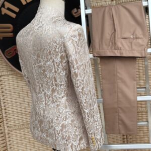 The coat or jacket includes a two-button closure and a notch lapel, while the coordinating waistcoat and a paisley tie with contrasting colors complete the ensemble, ensuring a cohesive and distinguished look.