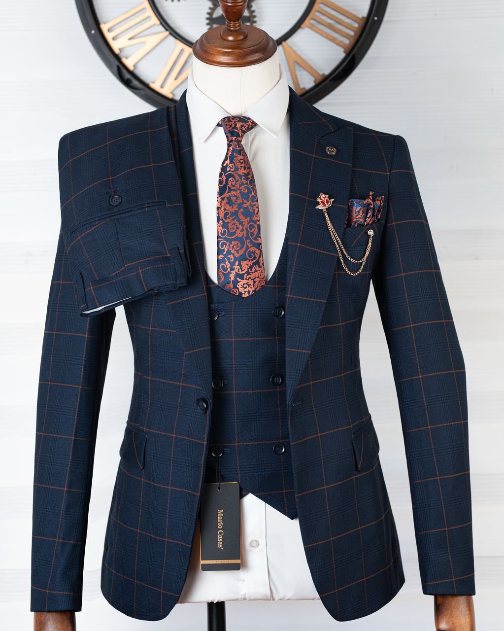 Navy Blue Plaid Mario Casas Three-Piece Suit