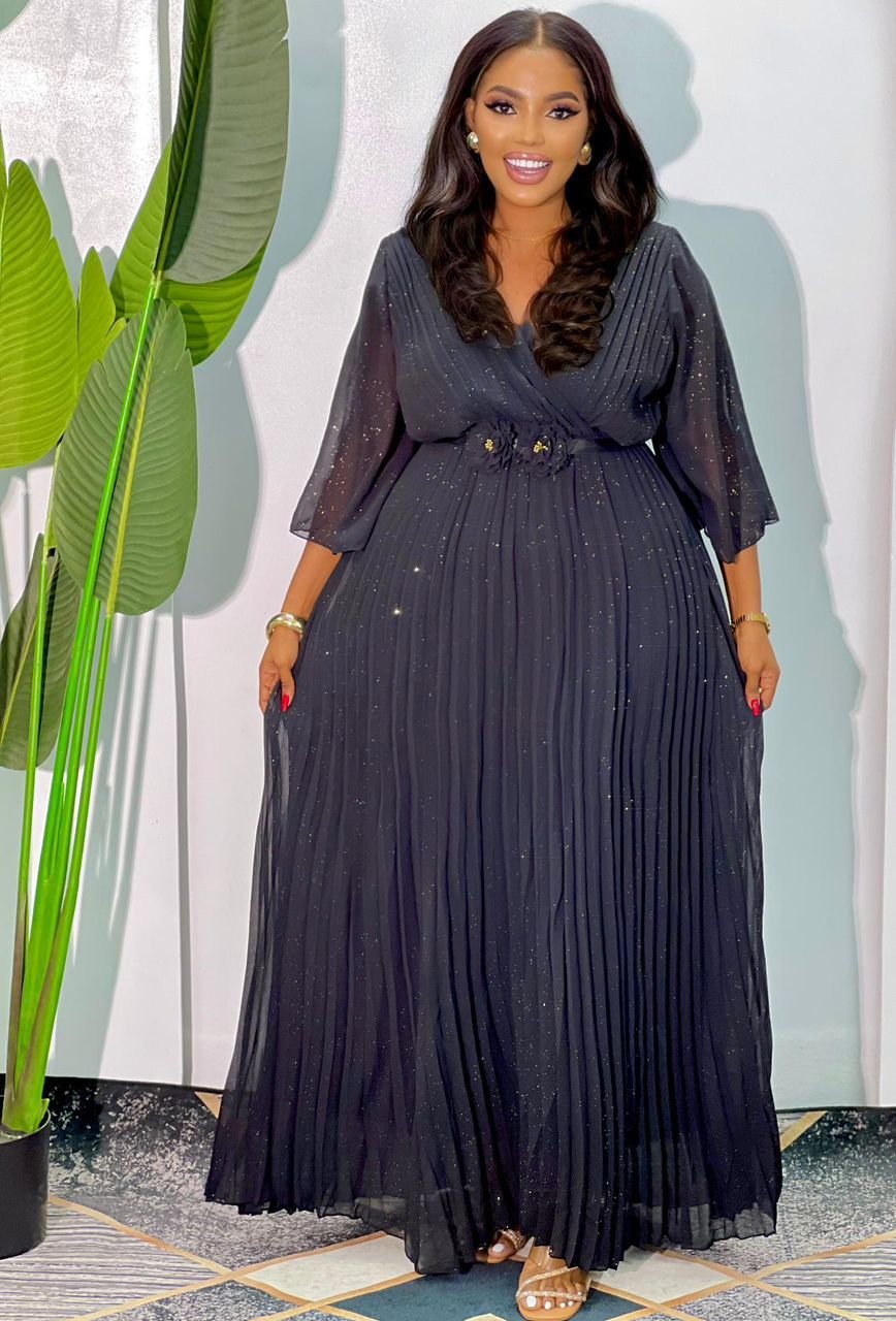The waist is cinched with an embellished detail, and the skirt is pleated, flowing to a floor-sweeping length.