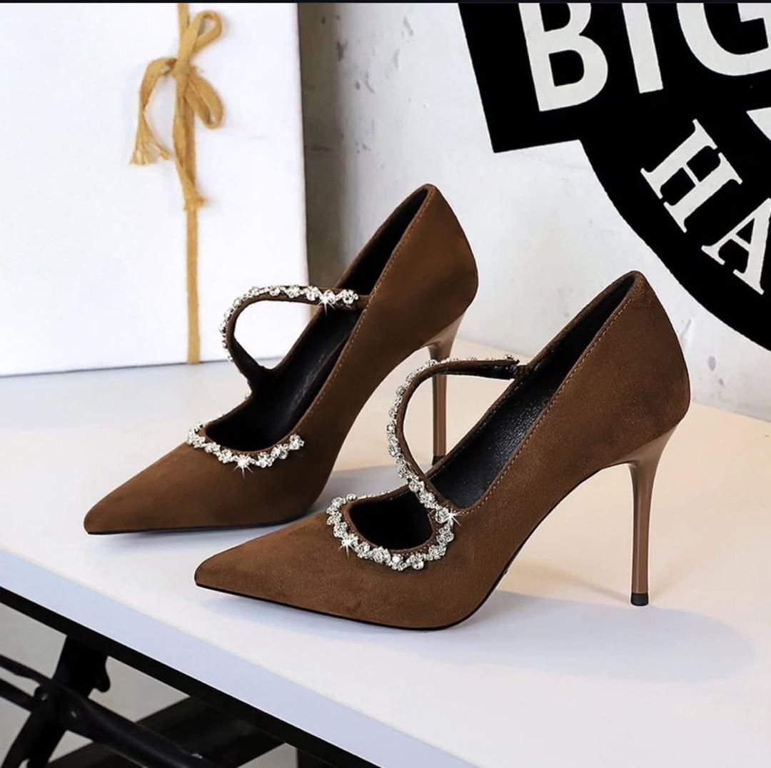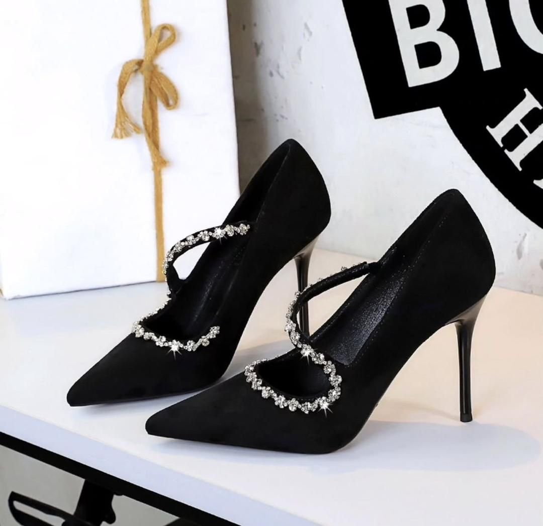Pointed-toe, high-heeled shoes featuring a crystal-embellished strap that wraps around the ankle.