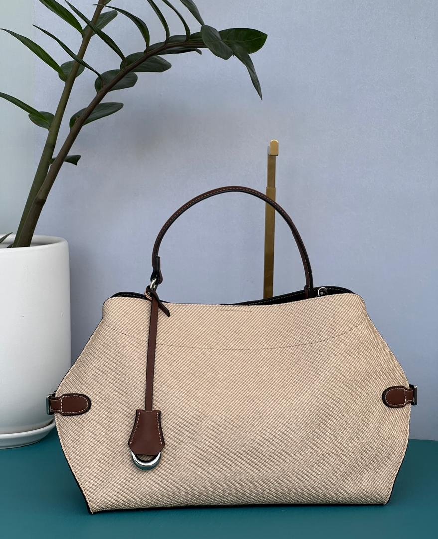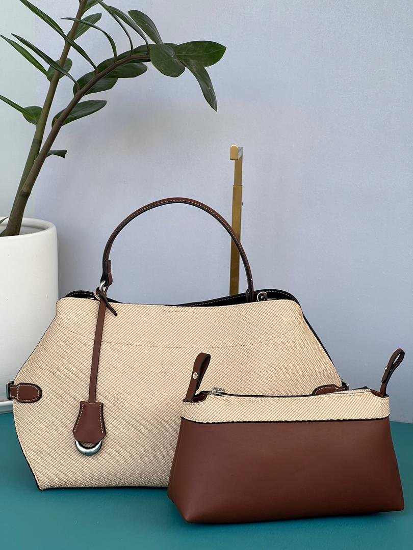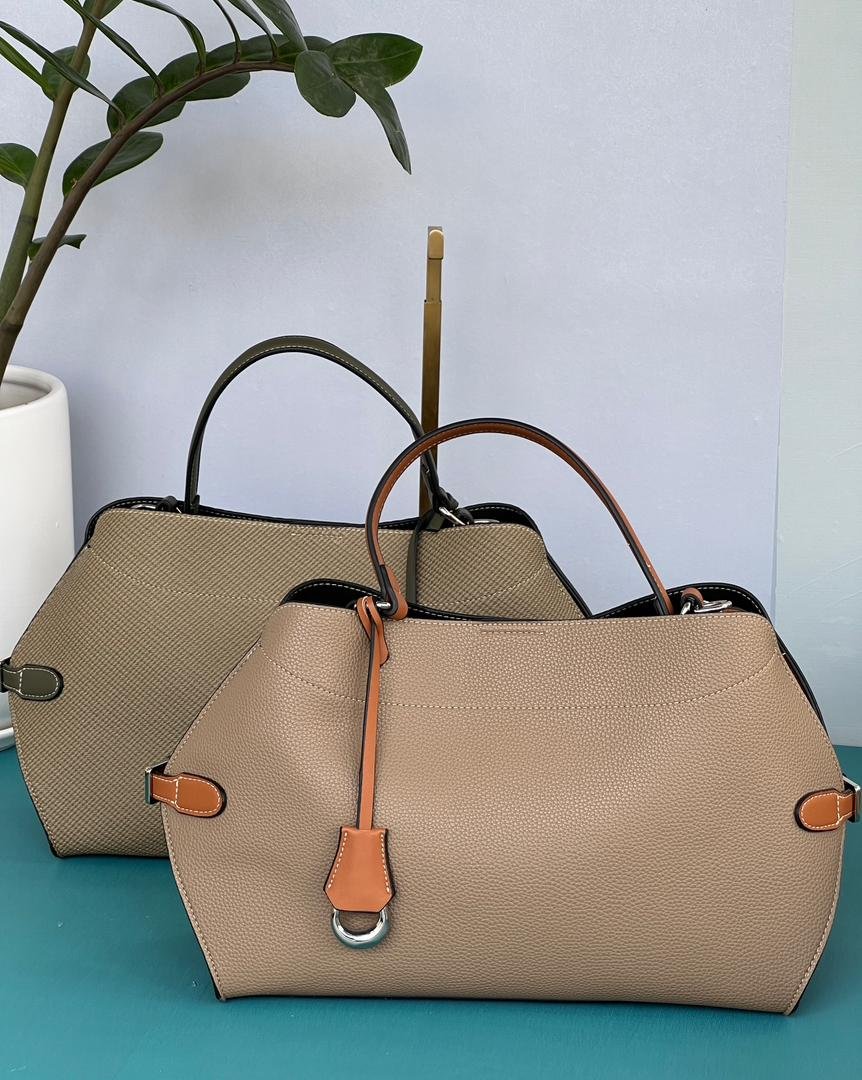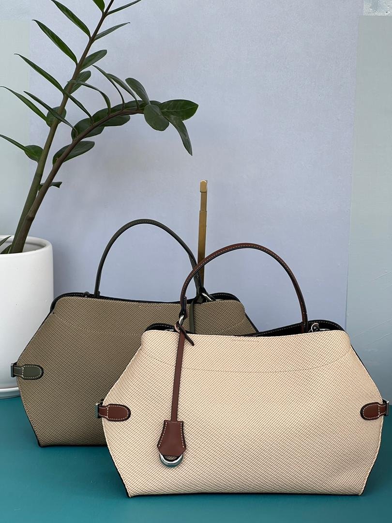 The larger bag is a structured tote in a neutral color and adjustable shoulder strap. Its spacious, open top and clean lines make it a practical and elegant choice for carrying everyday essentials, from work documents to shopping.