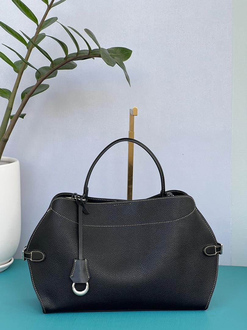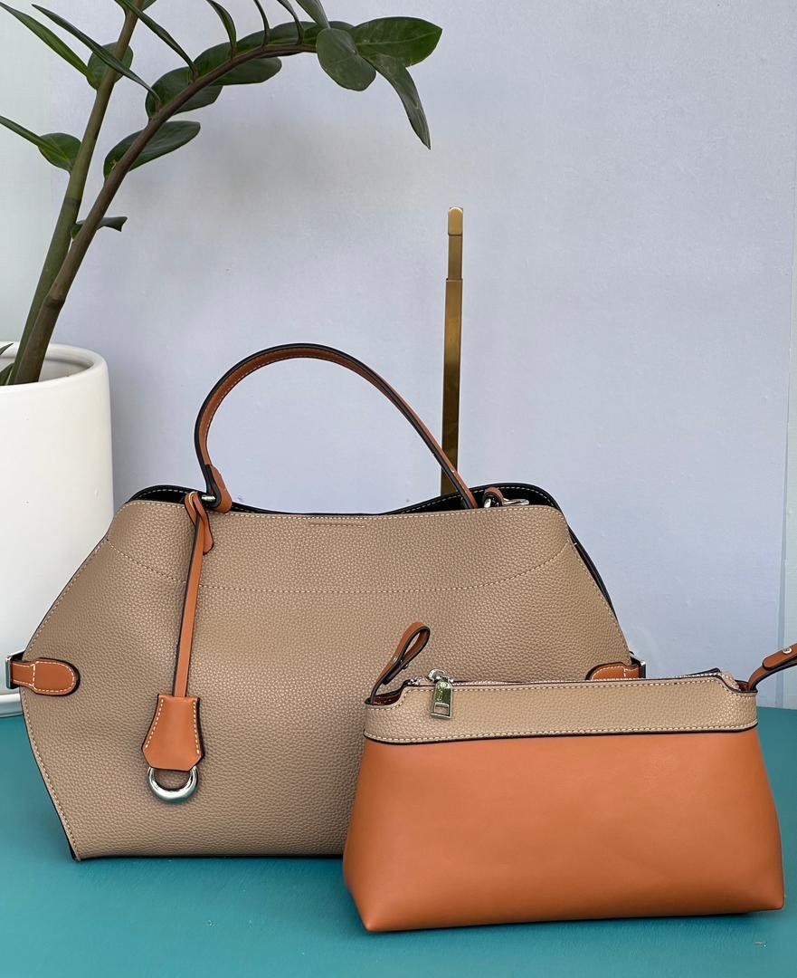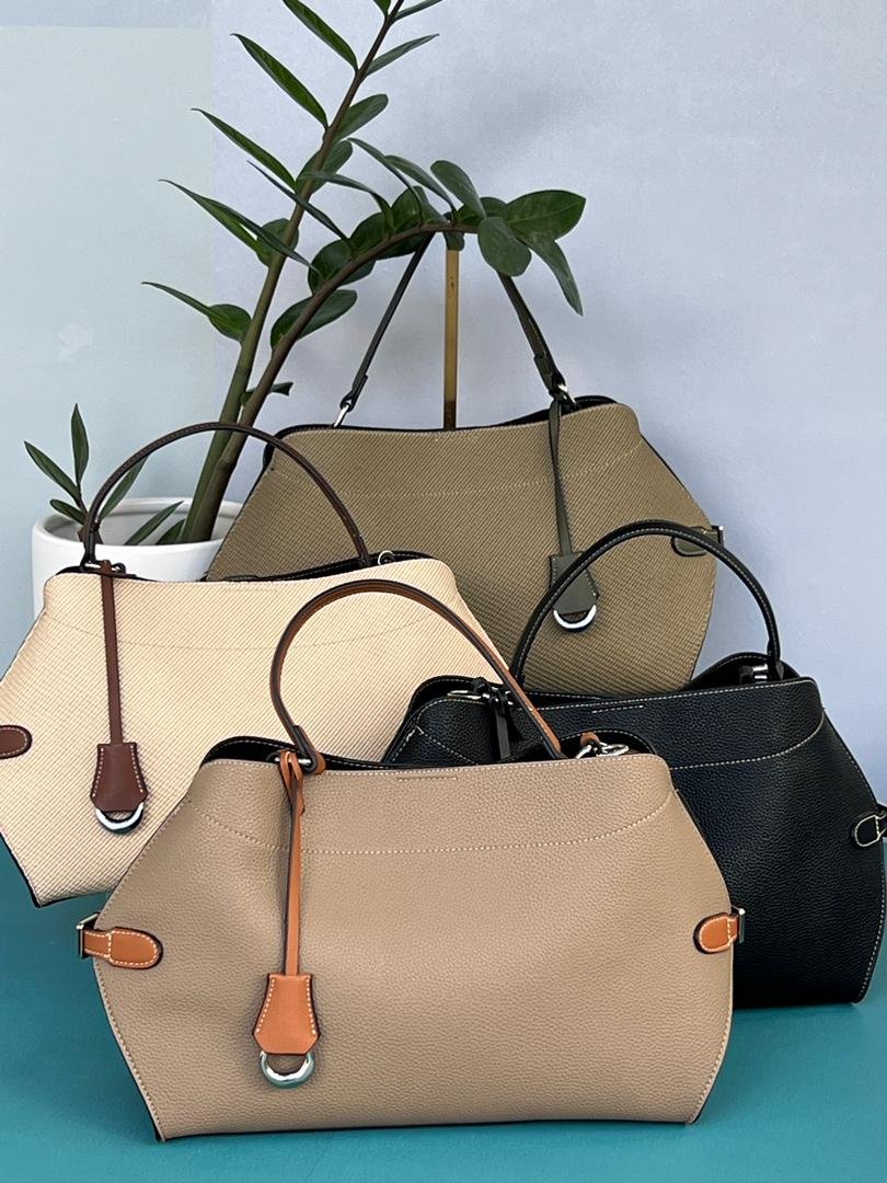 The larger bag is a structured tote in a neutral color and adjustable shoulder strap. Its spacious, open top and clean lines make it a practical and elegant choice for carrying everyday essentials, from work documents to shopping.