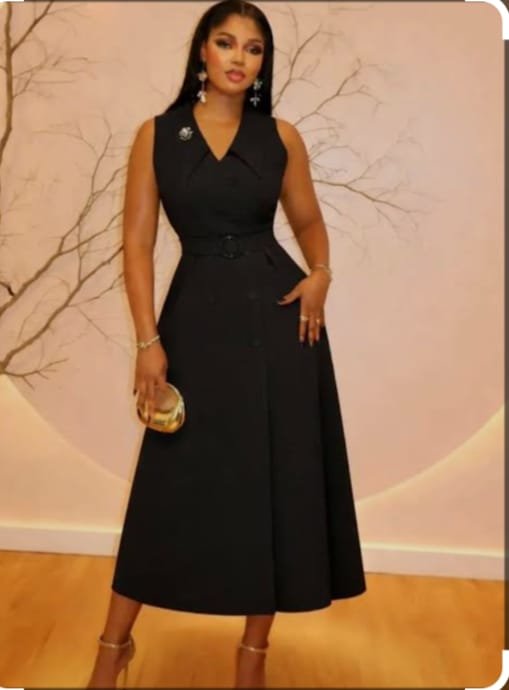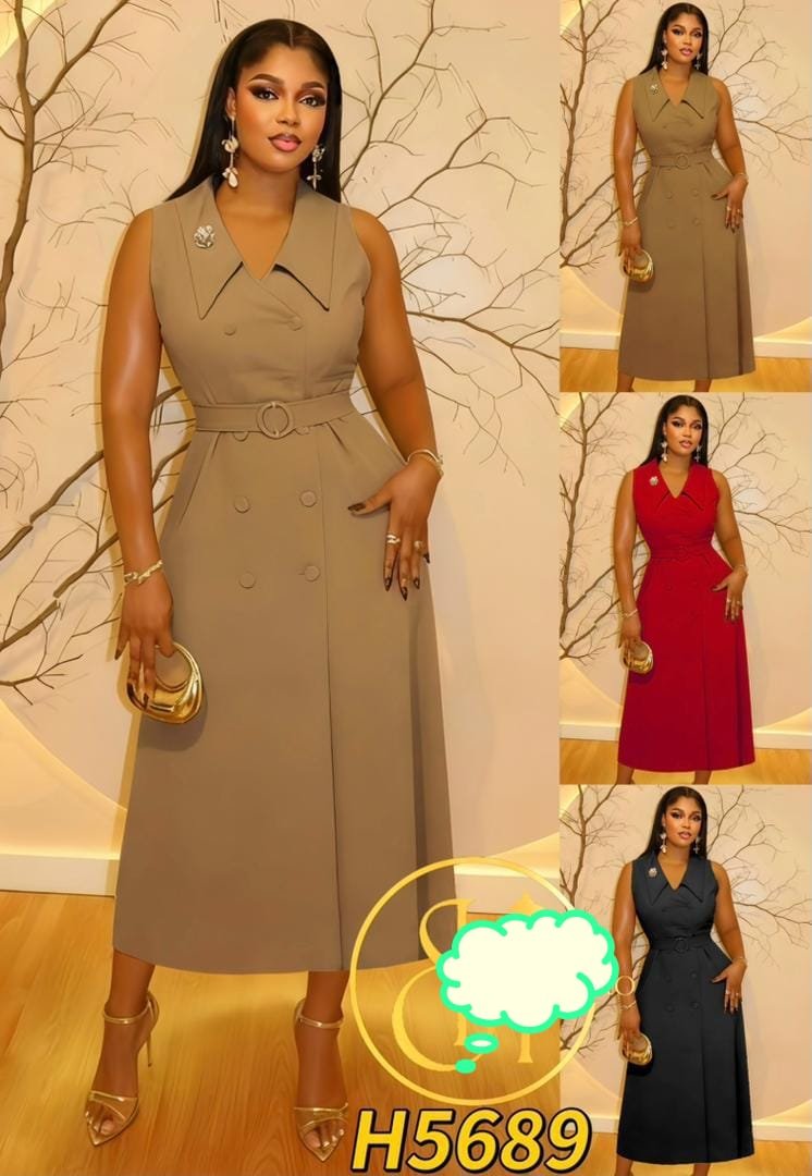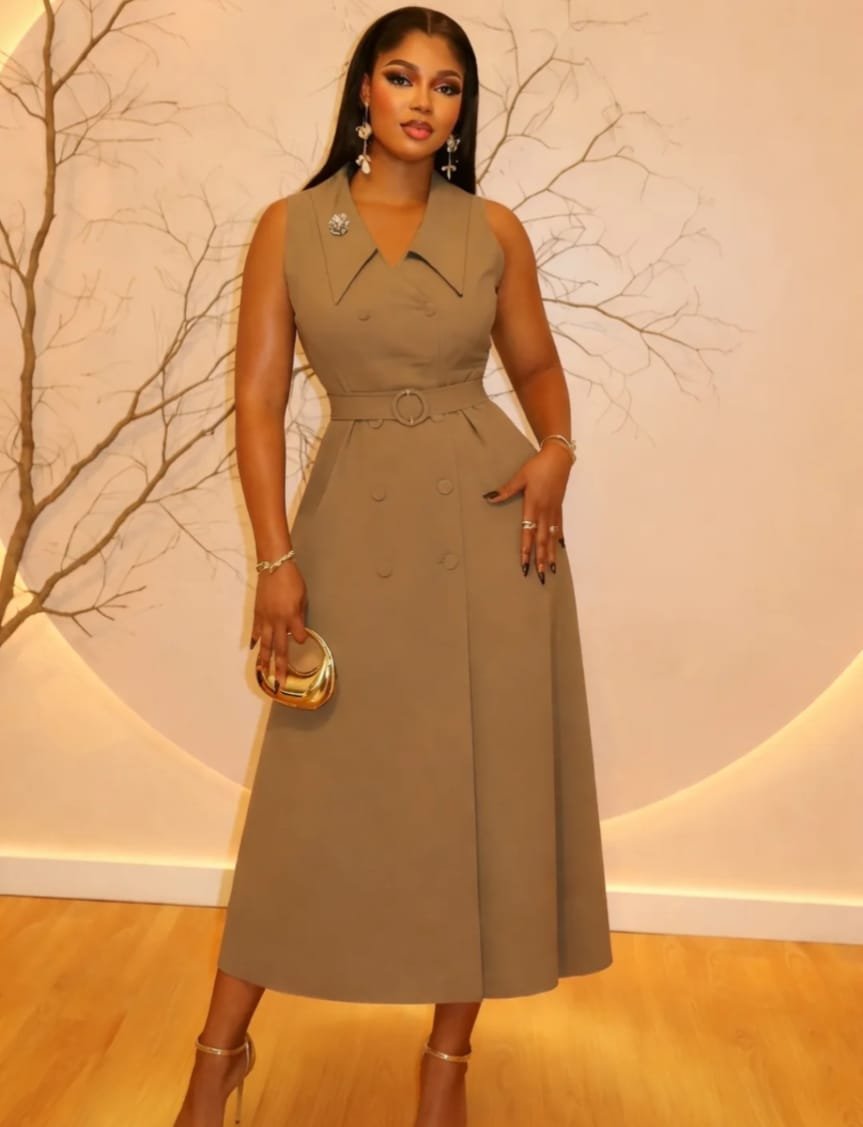 This chic, sleeveless dress features a classic double-breasted design with elegant buttons and a flattering V-neck lapel collar. The included self-tie belt cinches the waist, creating a polished and feminine silhouette.