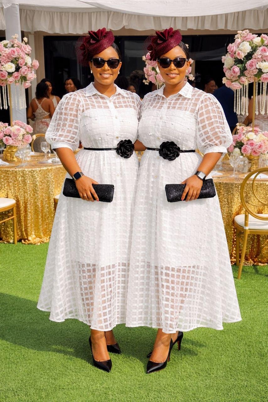 Details: The dress is cinched at the waist with a thin belt, often featuring a signature floral appliqué or decorative buckle to create an hourglass figure.