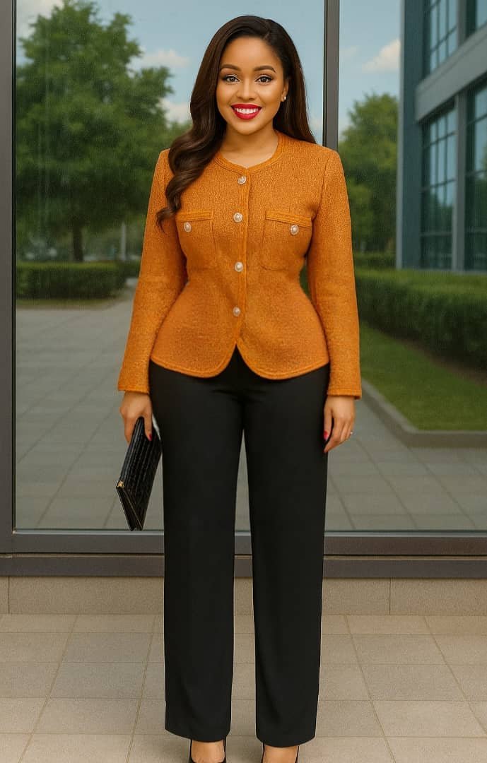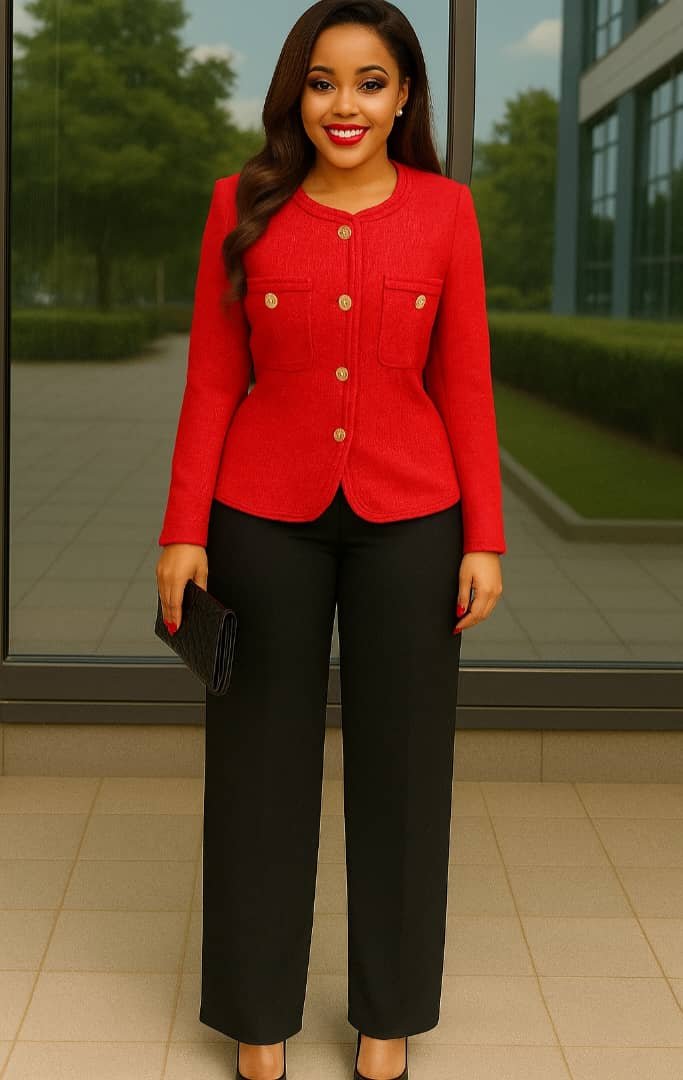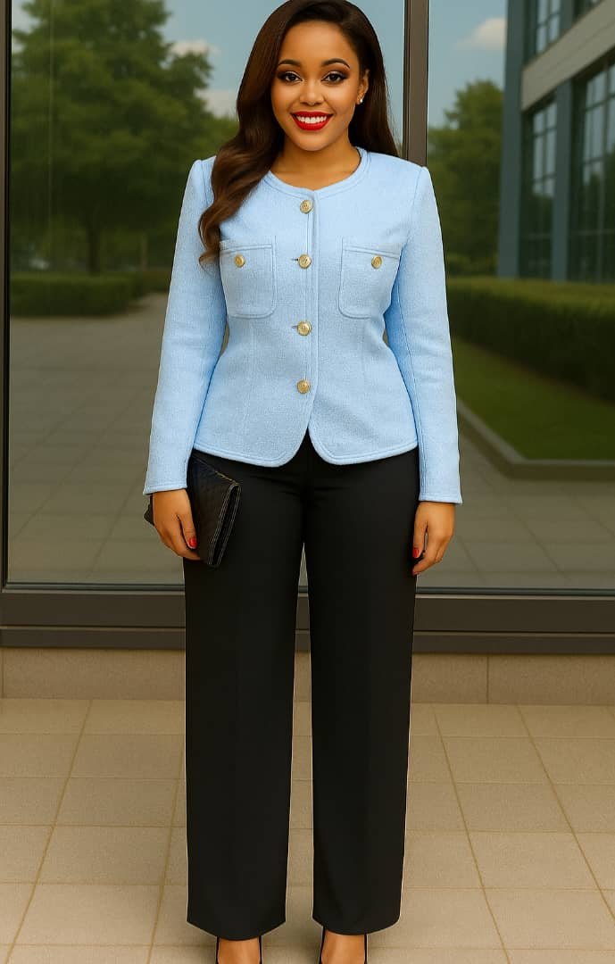 Timeless Pantsuit with Black Pants and Colourful Collarless Long-Sleeved Jacket