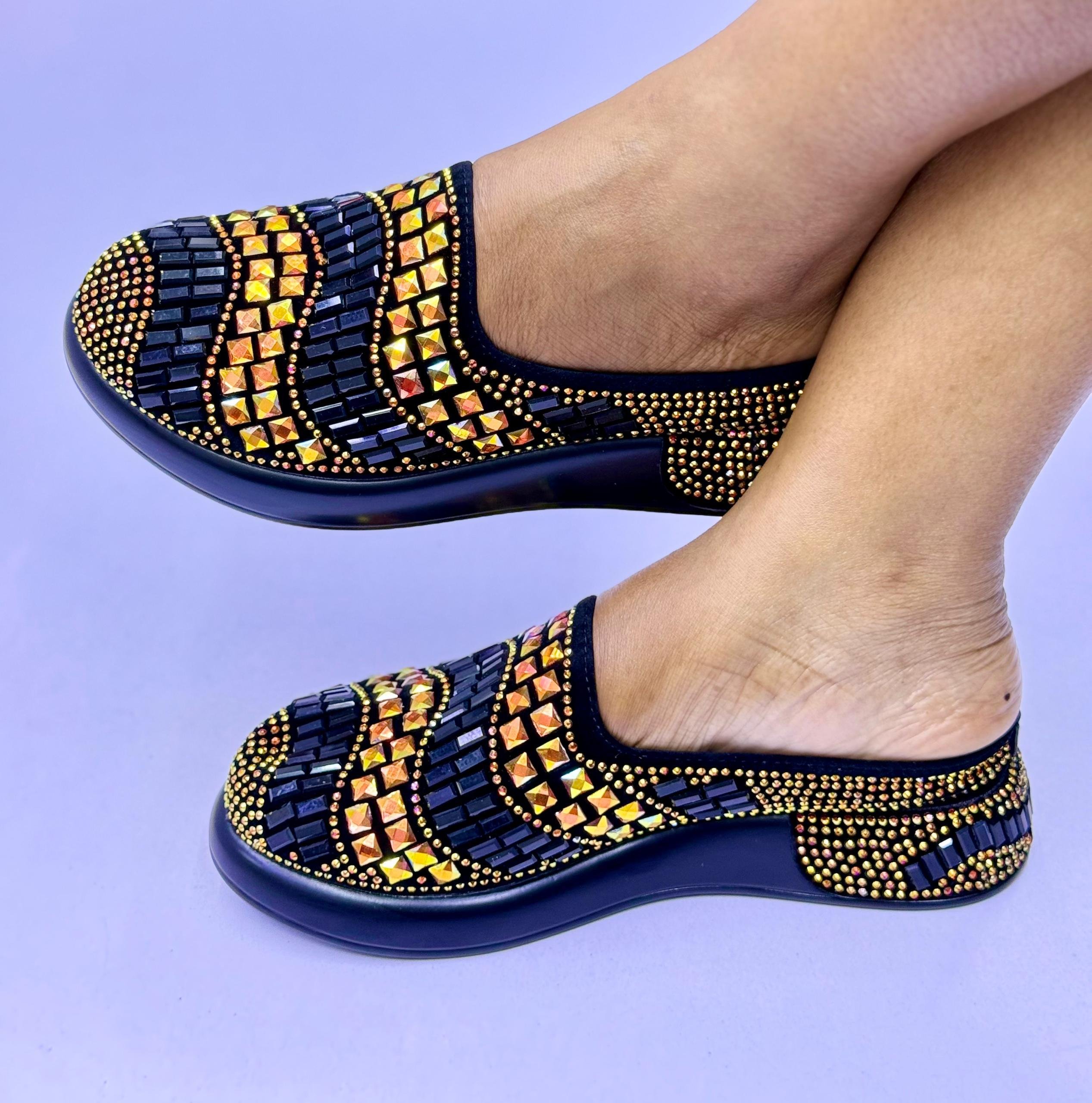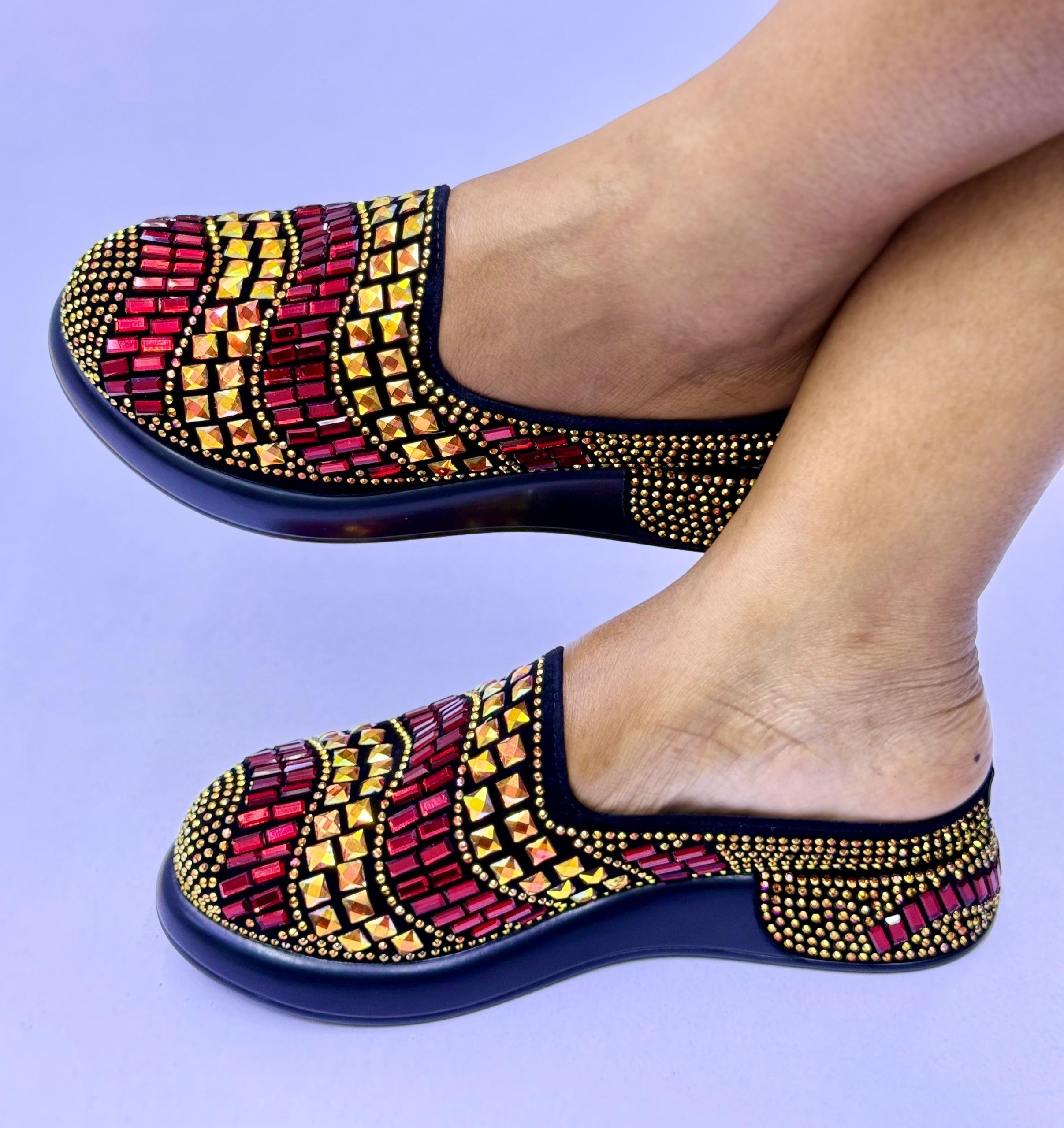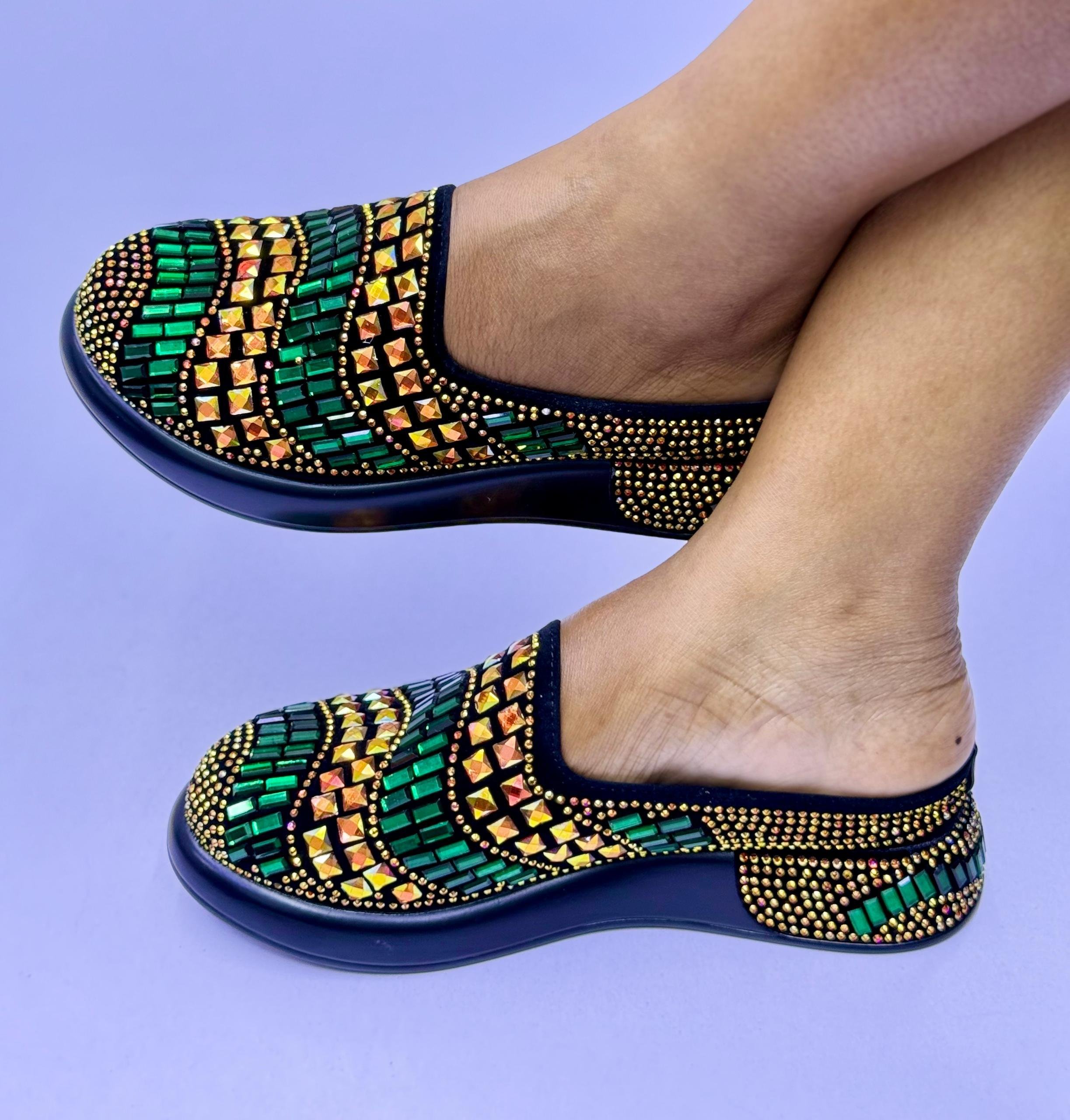 The sandals feature a colorful beaded or rhinestone-like design on the upper part of the shoe, with a low, comfortable heel or platform sole.