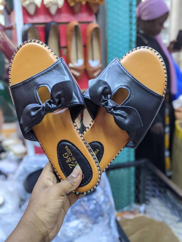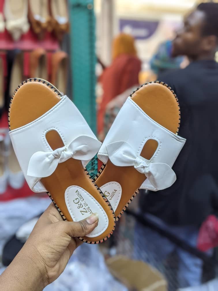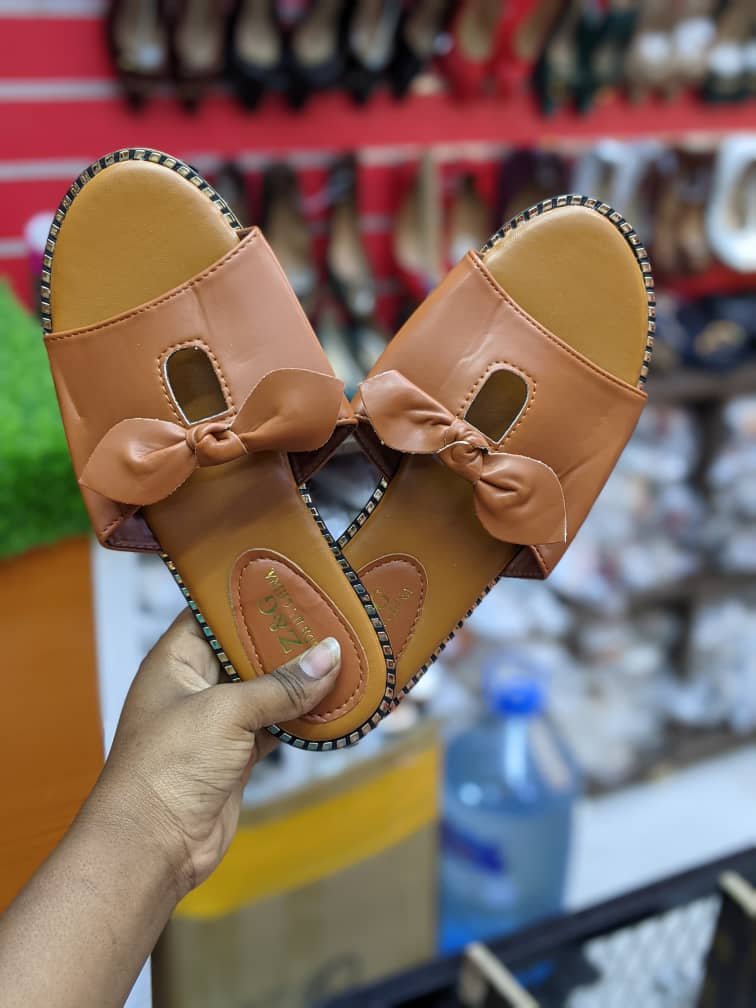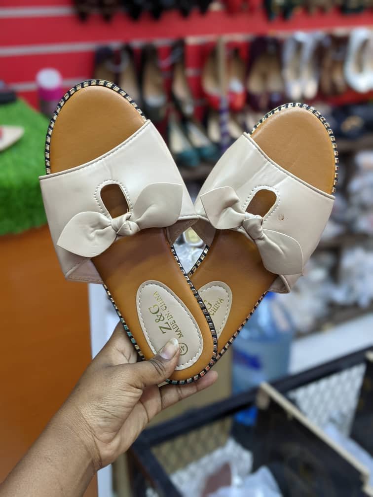 Design: The strap features a bow detail at the center. The edges of the sole have a decorative, studded trim.